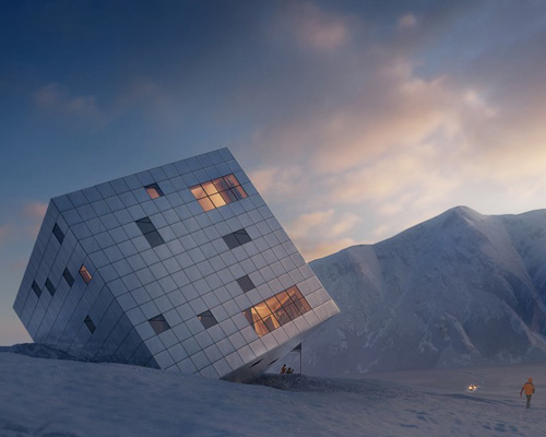 for an international competition aimed at the design of a lodge located in the high tatra mountains of slovakia, atelier 8000 has proposed a cube volume rotated onto one of its corners. known as ‘kežmarské hut’, the structure is intended to be a sustainable dwelling for high terrain adventurers during all seasons of the year, able to perform autonomously in regards to energy usage.