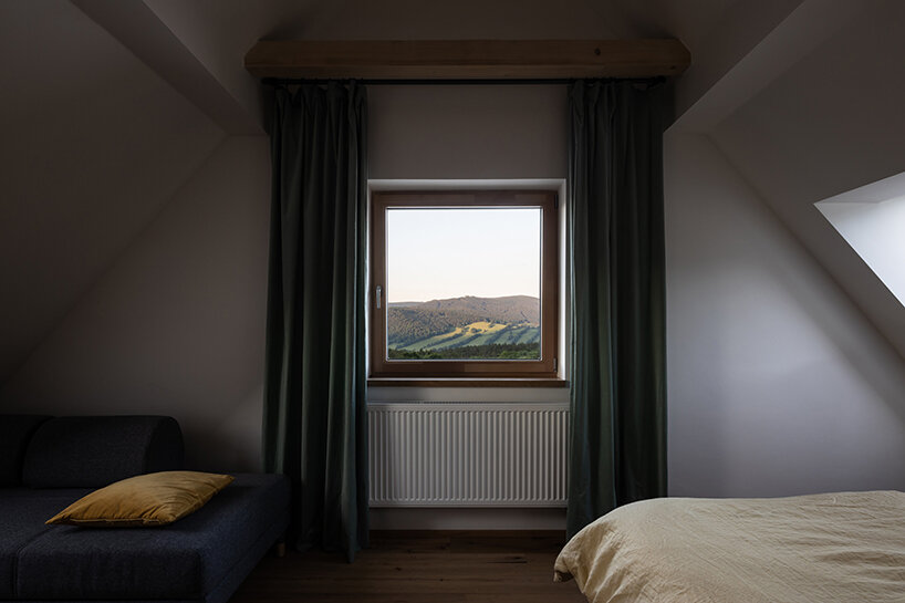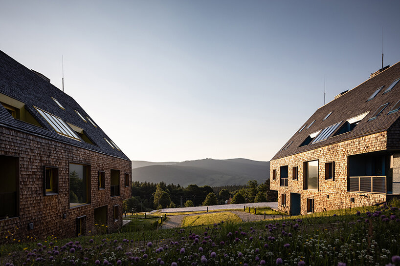 As clearly displayed, ‘Apartments Filipovice’ relies on traditional materials, characteristic of the Jeseniky region and Czechian culture. CL3 (see more here) first erected the buildings atop strip foundations before composing each residential part as a hybrid of sand-lime brick walls and reinforced concrete ceilings. Meanwhile, larch shingles extracted from the local forest were used to clad each building exterior — ‘a free paraphrase of the façades of local barns, and gabels of residential buildings,’ continues the studio.