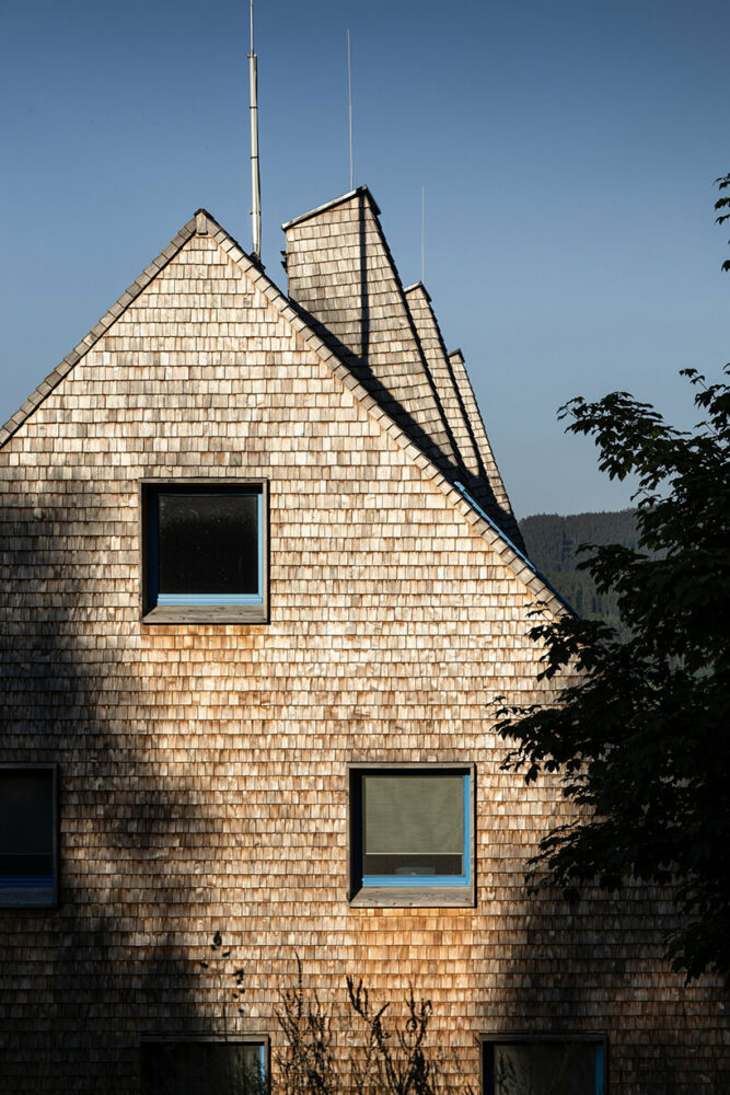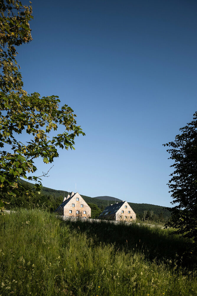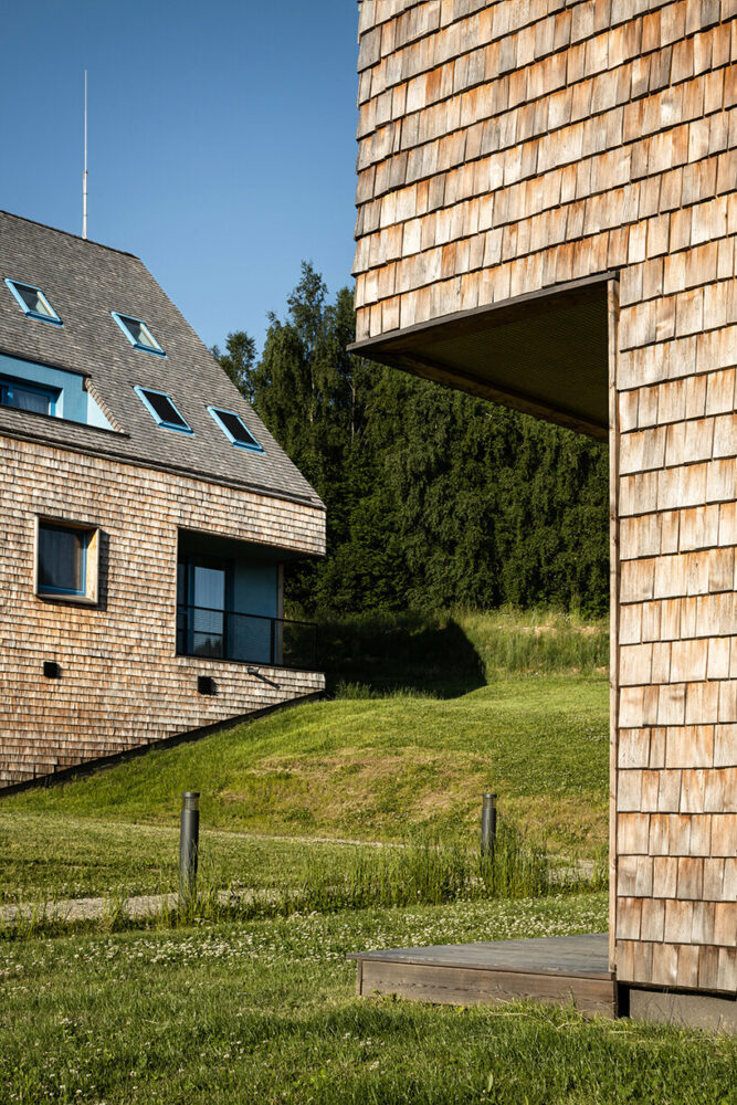 the project sits like a ring placed over the terrain, with its funnel-like roof forming a shaded perimeter walkway and an introverted core.