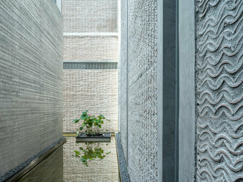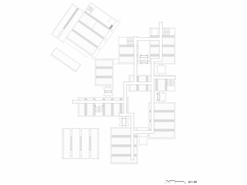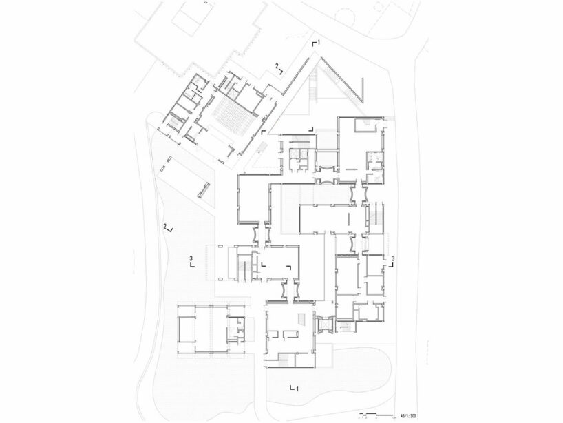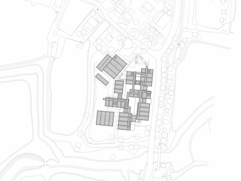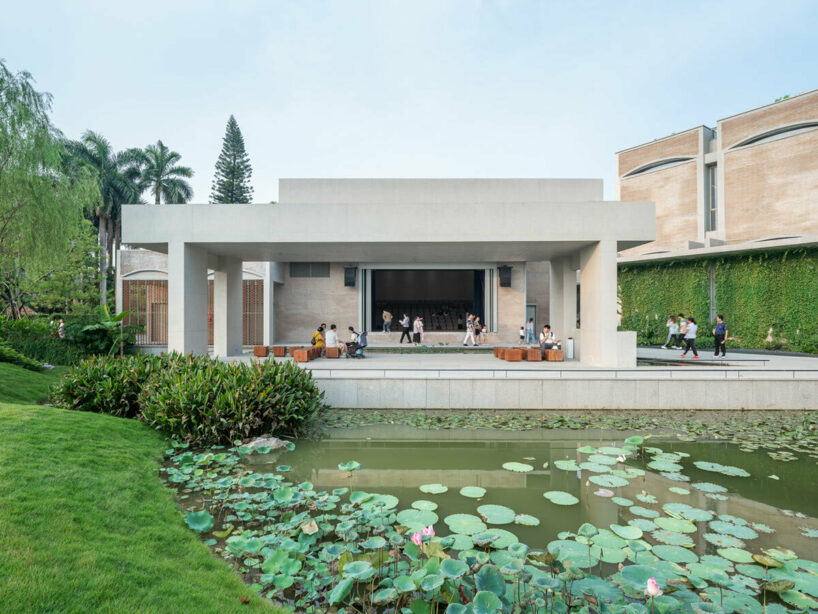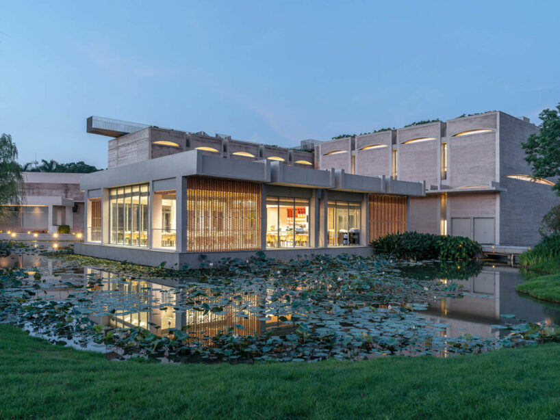 the project sits like a ring placed over the terrain, with its funnel-like roof forming a shaded perimeter walkway and an introverted core.