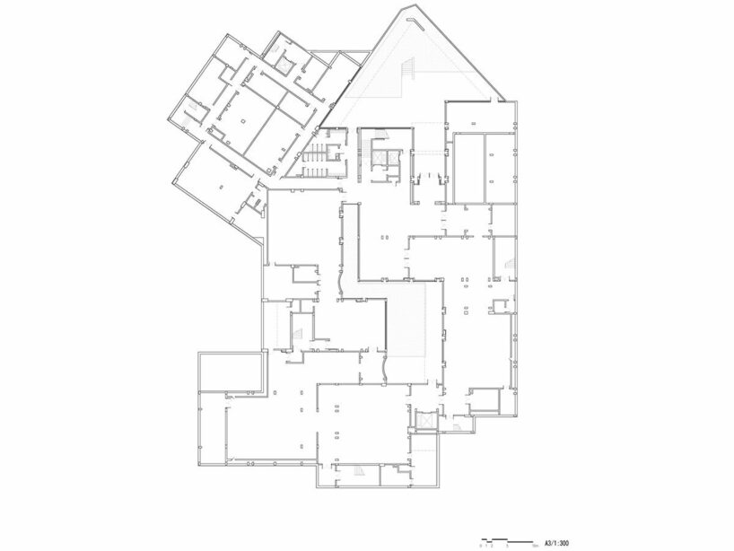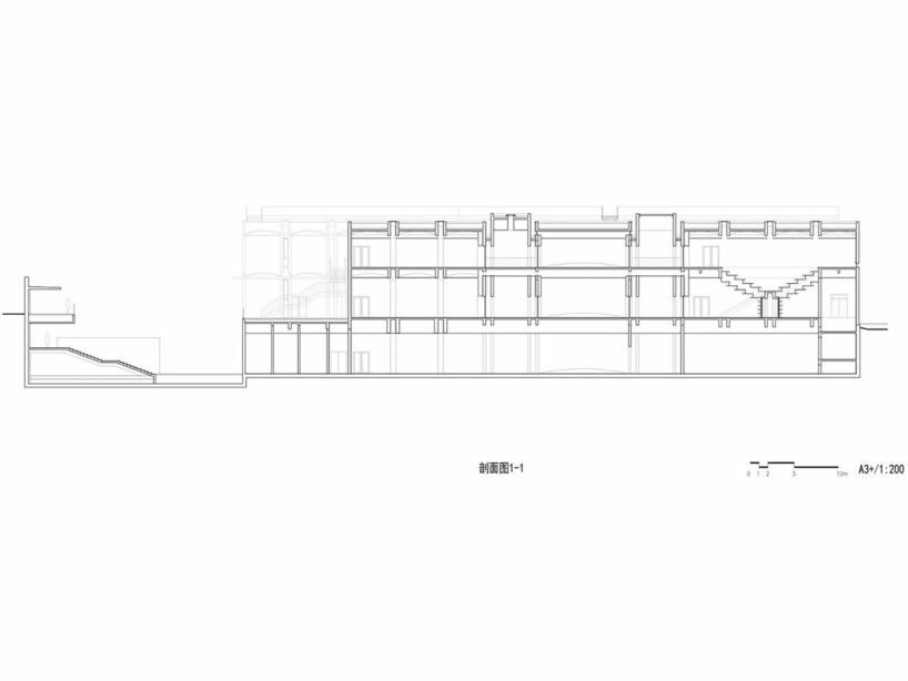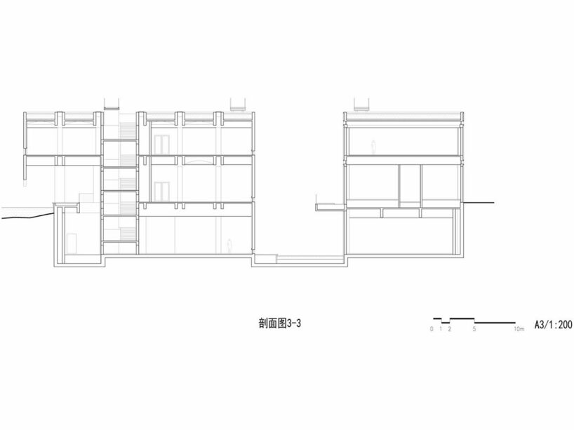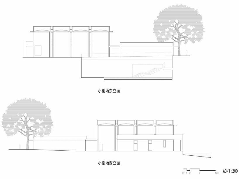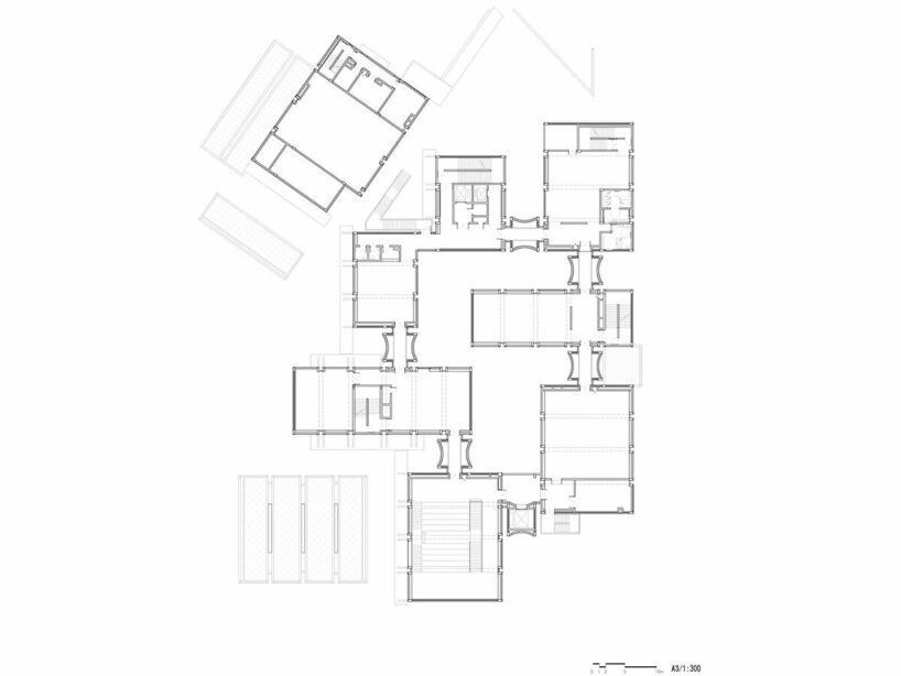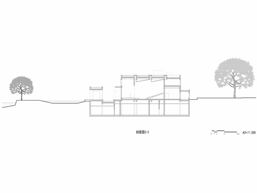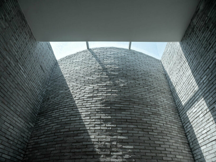 the project sits like a ring placed over the terrain, with its funnel-like roof forming a shaded perimeter walkway and an introverted core.