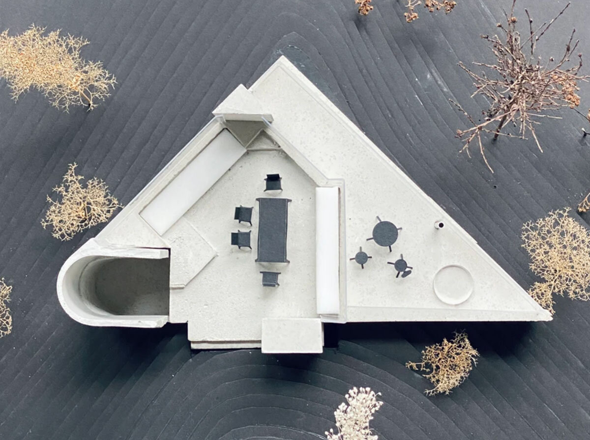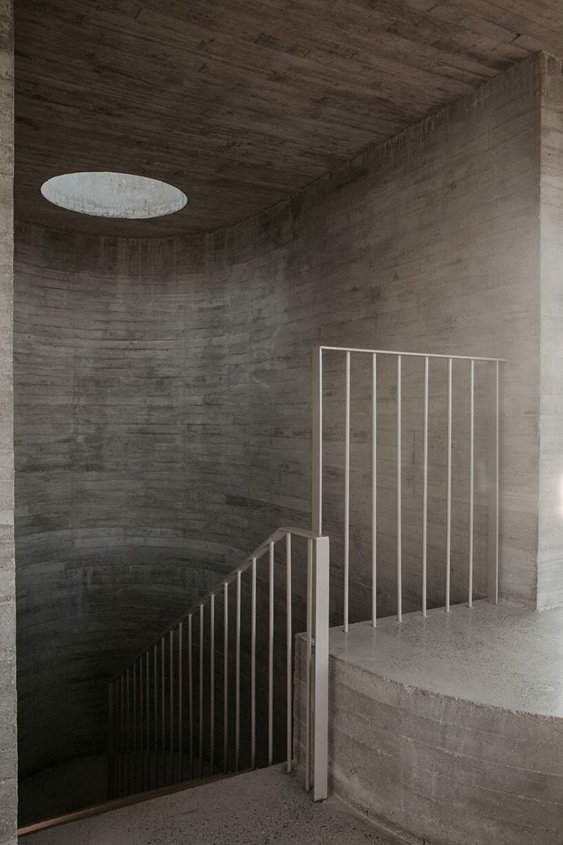 a triangular layout, cylindrical staircase, and circular terrace form a cohesive architectural composition