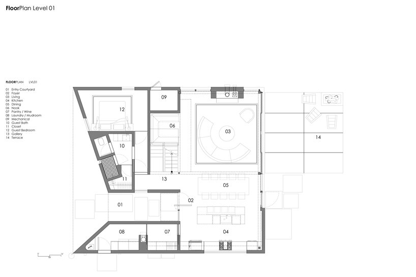 the project sits like a ring placed over the terrain, with its funnel-like roof forming a shaded perimeter walkway and an introverted core.