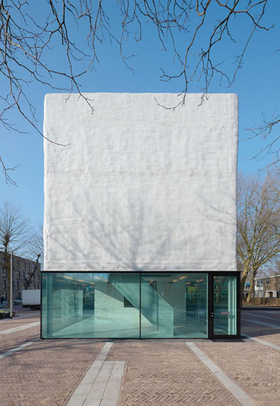 the project sits like a ring placed over the terrain, with its funnel-like roof forming a shaded perimeter walkway and an introverted core.
