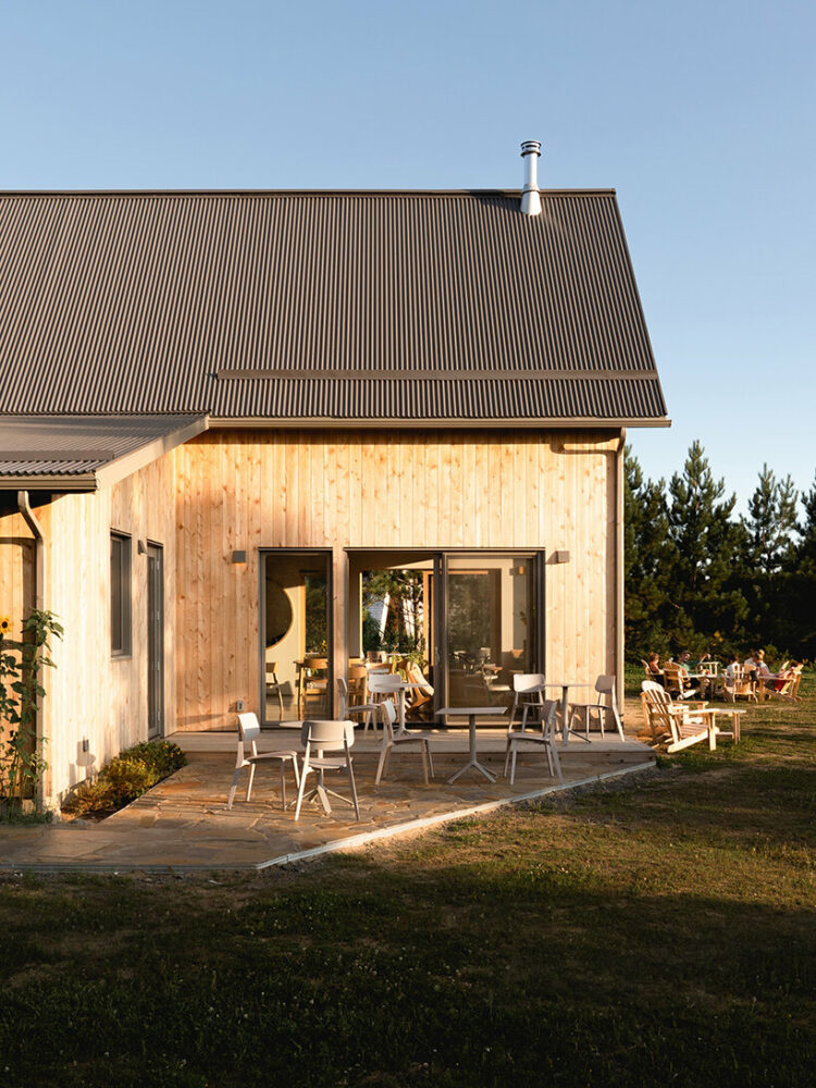On the riverside, to the south of the road, the café sits at the heart of activities offered on-site. One enters this welcoming building through a small market, offering visitors seasonal products from the Farouche vegetable farm and other goods such as cheeses, beers, and wines from local producers. Moreover, the dining area and its kitchen offer passing visitors and cabin guests the opportunity to taste meals from the farm’s production.