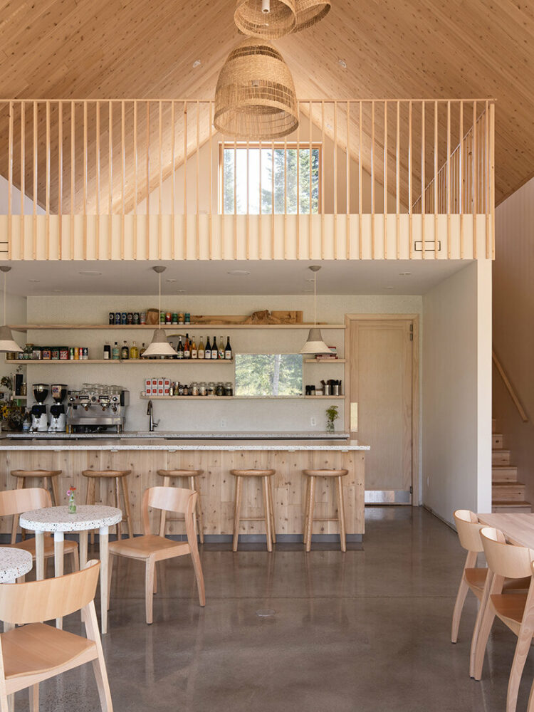 The café lounge opens towards the river, its large west-facing windows offering unique views of Mont-Tremblant and sunsets behind the Laurentian mountaintops. At its center, the wood stove fire invites patrons to gather and observe nature’s ever-changing silhouette. Nestled in the cathedral roof, a mezzanine space offers a quiet, set-back living room. More so, the structure’s materiality exudes sober tones; its charcoal-colored steel roofs and natural hemlock siding gently nod to vernacular farm buildings.
