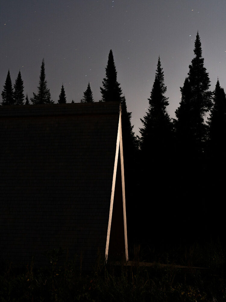 The ‘Farouche Tremblant’ project by Atelier L’Abri (see more here) was documented by photographer Raphaël Thibodeau over a twenty-four-hour period to capture the site’s evolution, from the sunrise over the river to the nocturnal observation of the cabins illuminated by the moonlight.