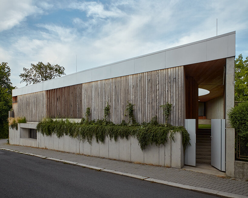 the atelier štěpán-designed ‘internal landscape villa,’ negotiates a gently sloping terrain, which is fully reflected in the concept. the architects organize the dwelling as an inward-facing landscape — an inverted living experience with subtle openings into the outside world. the villa is horizontally divided into three different platforms, with its entrance platform at the street level made of concrete, hosting the utility rooms. the main living platform with the social area is elevated by a little less than a story above the street level.
