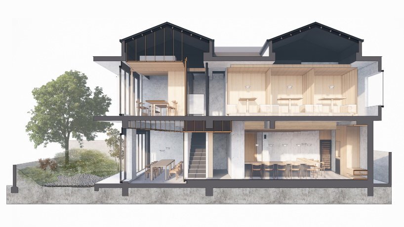 the architects chose to conceal the service space of the restaurant at the back, maximizing the view towards the garden at the dining area. the reconfiguration of the new linear stairs divides the space more efficiently and enables the space to be fully utilized. the four new load-bearing walls on the ground floor partition the kitchen, the front serving, prep area, and the private dining rooms, and at the same time serve as the structural reinforcement for the existing structure.