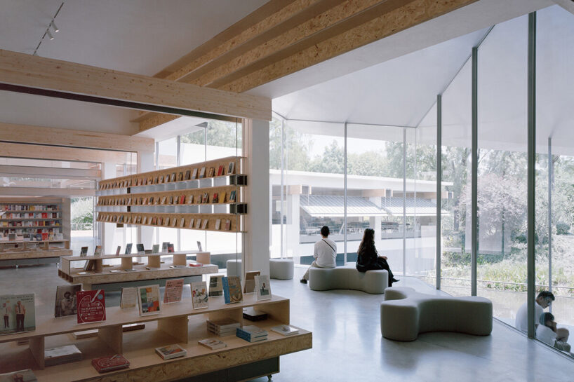 the sunken waterside pavilion uses sloped roofs and recessed seating to engage the wetland