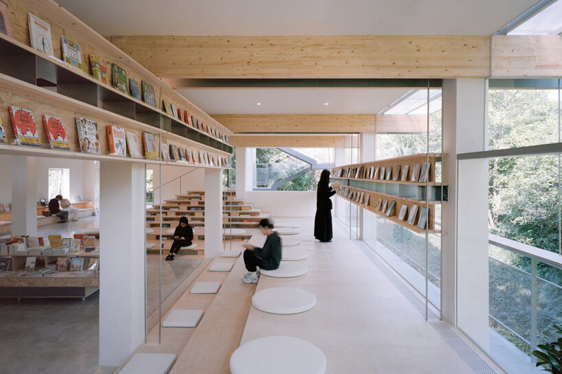 the project sits like a ring placed over the terrain, with its funnel-like roof forming a shaded perimeter walkway and an introverted core.