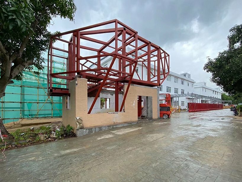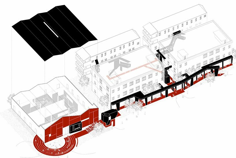 the project sits like a ring placed over the terrain, with its funnel-like roof forming a shaded perimeter walkway and an introverted core.