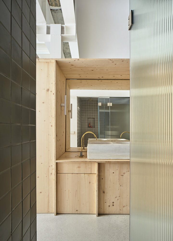 In the day area, we have a living room-dining room-kitchen. The kitchen is centered on a stainless-steel island and is supported by the main cabinet. In the night area, we have two bedrooms, a main one with an en-suite bathroom and an auxiliary room. Between both rooms, the bathroom areas are located. All the new actions are carried out with fir wood elements so that the new interventions are clear while providing the warmth that a space with little light needs,’ concludes the studio.