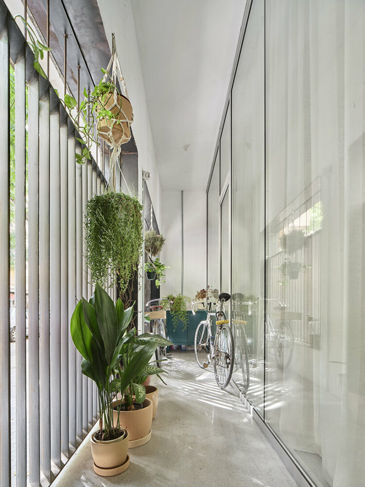 To start, the team recovered the backyard, reimagining it as a spacious patio where the footprint of the outdoor wall tiling is maintained as an acoustic cushion and textural support for the potted plants. Furthermore, Auba Studio opened up the wall that initially separated the rear, the old kitchen, from the front, creating light continuity between both ends. Complementing that ‘expansion’ are two stained glass windows set up from wall to wall, one on the front and one on the back facing the patio. Meanwhile, a newly added two-meter-wide porch, composed of wood and glazing, extends towards the terrace.