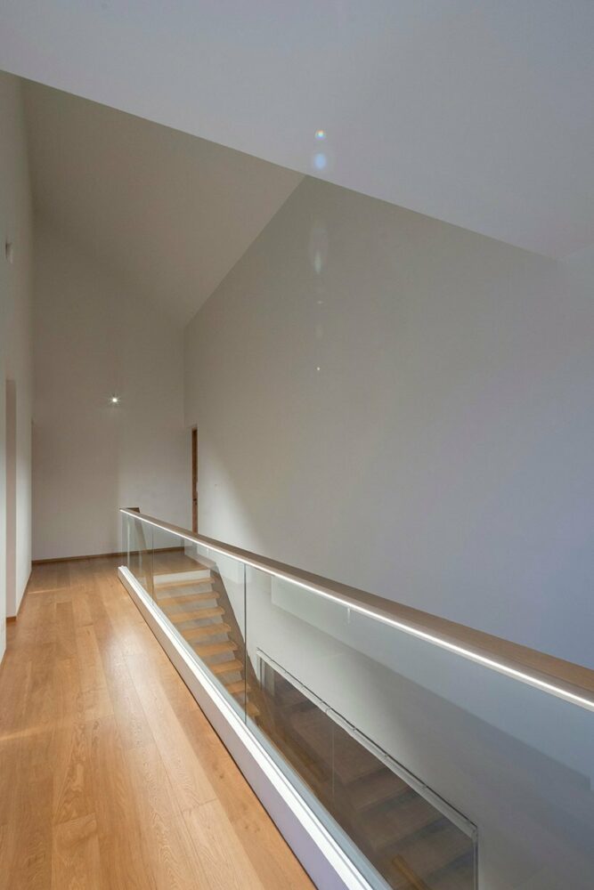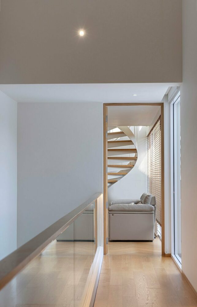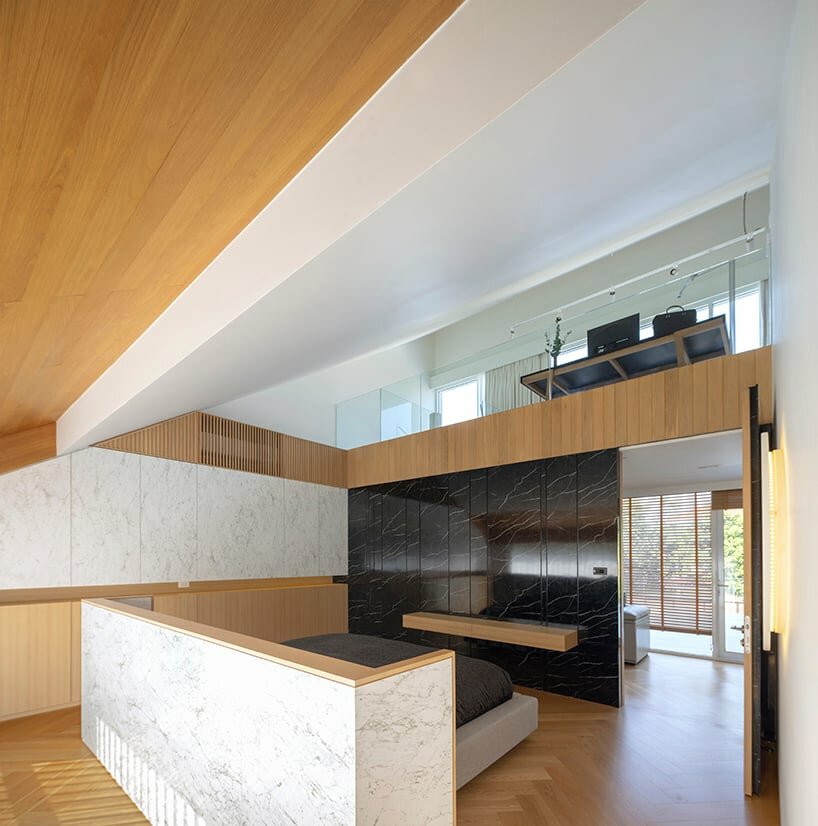 The project aims for a neat and simple design and follows a concept of assembling the simplest geometric shapes together. The design team places a triangle form on top of the square shape of the ground floor base with minimal decorative elements. The triangle mass is also reflected in the interior space, with the slanted ceiling cut to the roof angle creating a unique space. The plan forms a private working area for the homeowner on the higher part of the triangle, where the mezzanine is placed. The concept of simplicity does not only cover the architectural mass but also the material selection. White tones and subtle materials are chosen for almost all the exterior highlighting the simple geometry even more clearly.