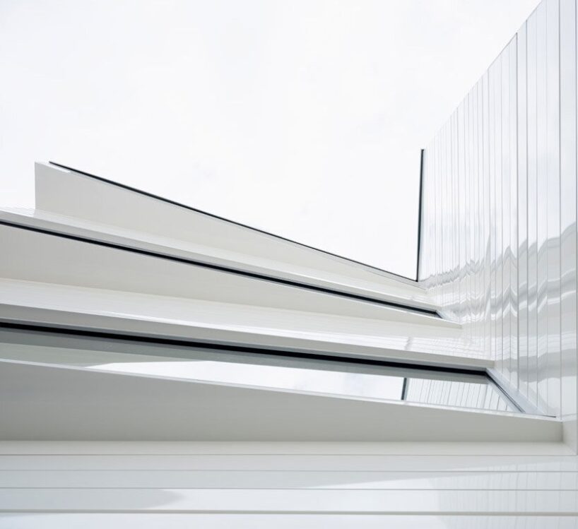 the design by avignon architecte (find more here) draws from the local topography, generating a structure that continues the ascent of the landscape. the volumetric wiggle gives each space a privileged and unique position in close connection with its environment. the search for light is a strong element in the project, which adopts a distinctive verticality and offers living spaces on four levels distributed by a sculptural ‘ribbon’ staircase. meanwhile, the concrete frame construction is clad with a chic white lacquered cladding laid horizontally. the levels are distorted in their reading by the position of the glass frames and the curtain wall on the garden.