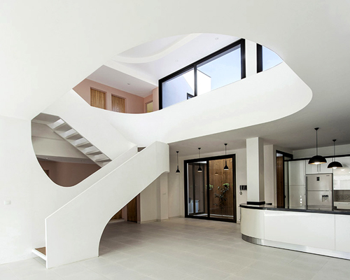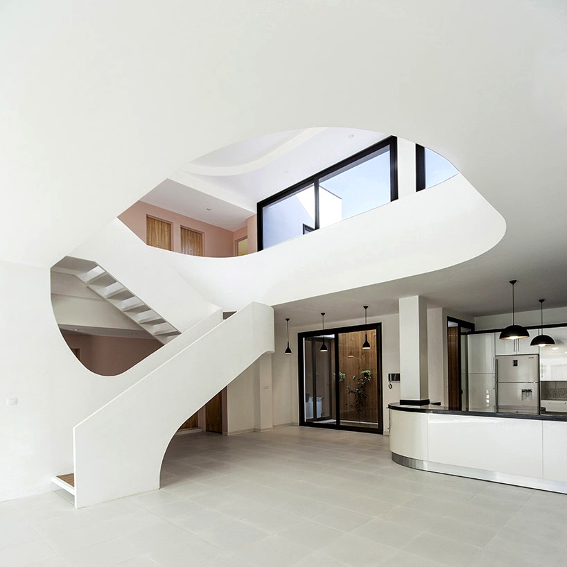 finally, the project’s façade was covered in white cement due to the client’s limited budget and the possibility of implementing smooth curved surfaces. harmonized with inside and outside, the ‘bahar house’ has now turned into an integrated volume in response to the client’s needs.