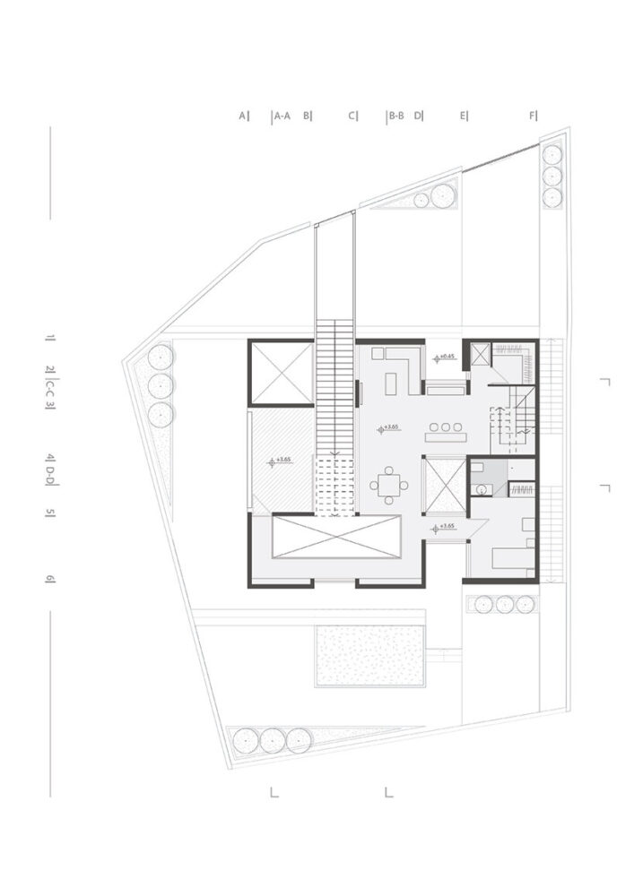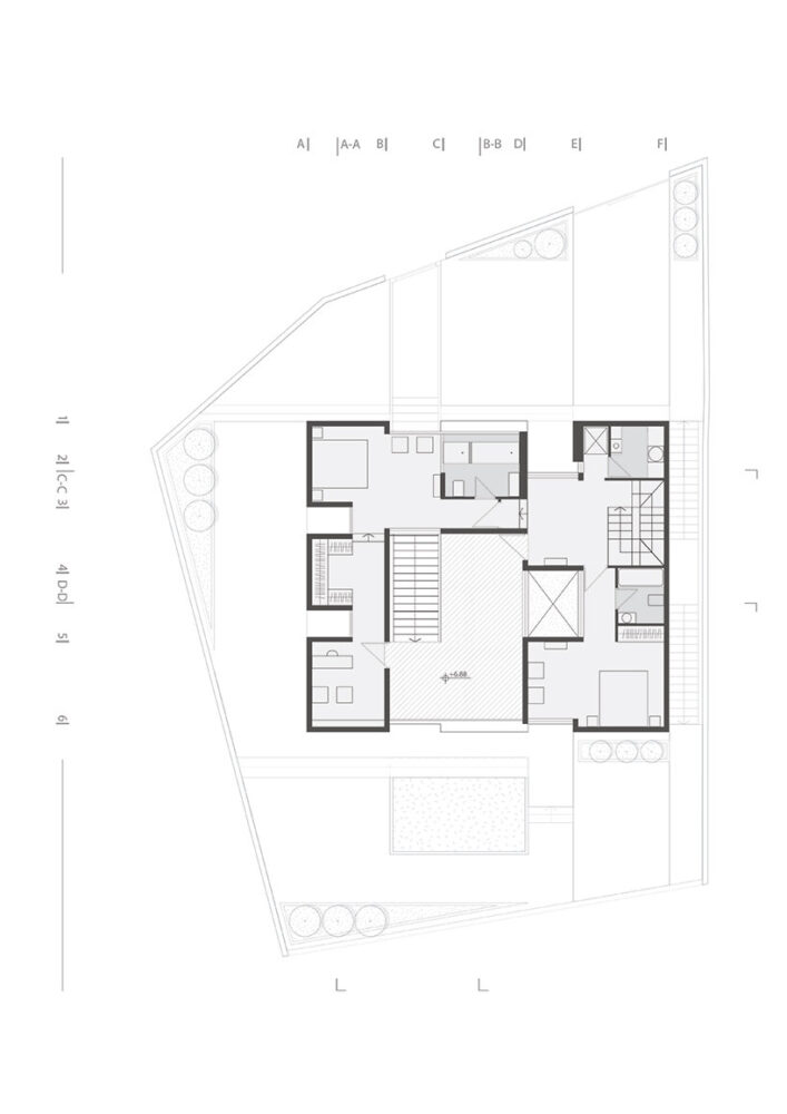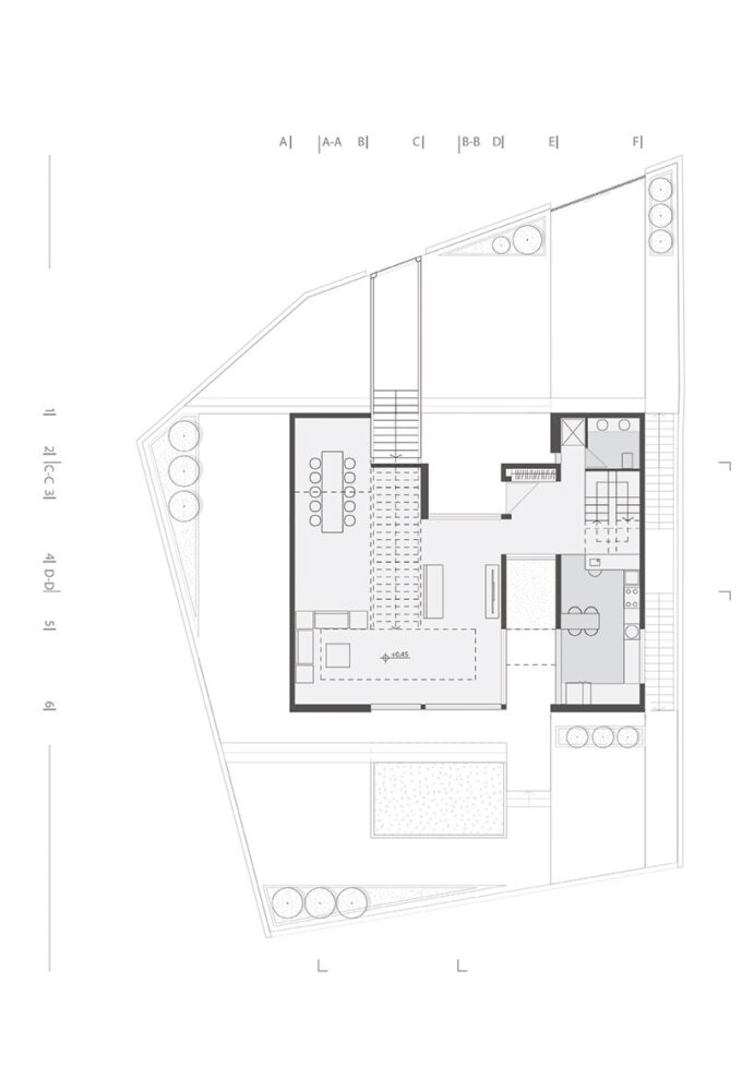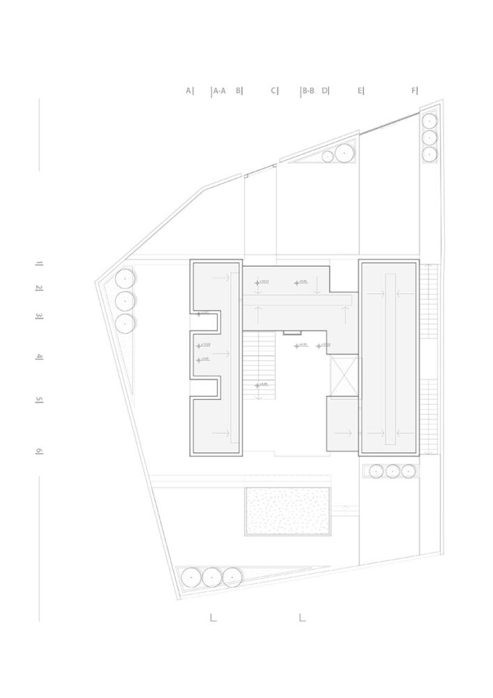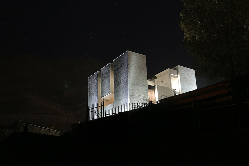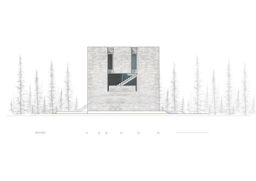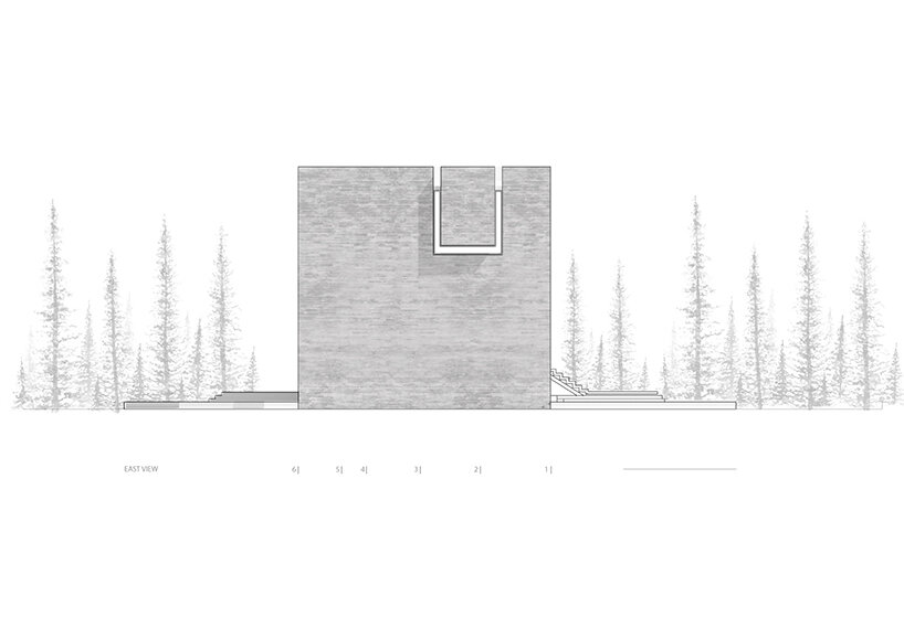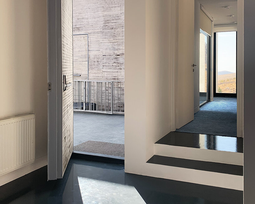 the project sits like a ring placed over the terrain, with its funnel-like roof forming a shaded perimeter walkway and an introverted core.