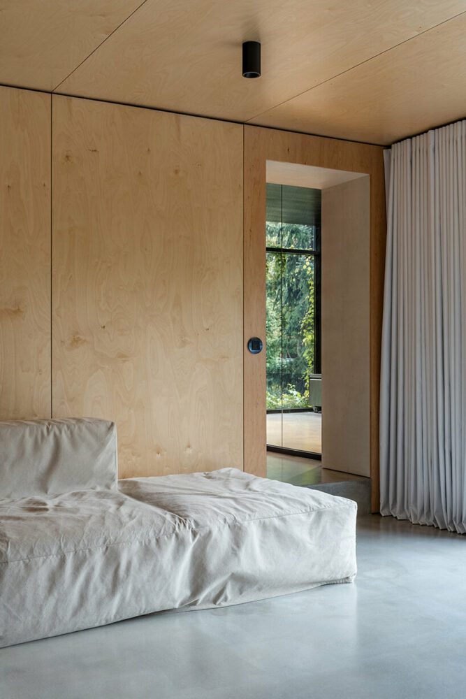 Relogged by balbek bureau is a redesigned private house located in the green zone on the Ukrainian riverbank. As its name suggests, the project reinterprets the log cabin concept and responds to the nature-infused setting, inviting tranquil and comfortable living. While exploring examples of redesigned log cabins, the architects couldn’t find any references that matched their preferences and overall vision — therefore deciding to trust their intuition. ‘We opted for a contrasting solution for the dark wood on the walls – light wall panels and textiles, neutral concrete flooring, and simple, minimalist geometry. As for the overall interior concept, the client’s stylistic reference was Rick Owens’ apartment in the Italian city of Concordia – grungy, brutal, and utilitarian,’ writes balbek bureau.