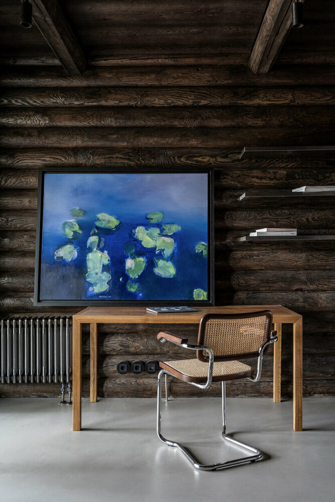 Naturally, the client’s request is a complete departure from the classic aesthetics of the log house. During discussions with balbek bureau (see more here), a decision was made to modernize that archetype while preserving the exposed wood inside the Relogged rooms. This decision was also technically motivated; fully covering the wood would have compromised the movement of the timber. ‘As the owners rent the house, we had to implement our ideas with minimal effort – using pinpoint construction changes and through furniture and interior solutions,’ explains the studio. One of these solutions included unifying the indoor wooden tones with a dark shade to echo the exterior’s palette. The entire log surface was sanded before staining, and balbek bureau took out as many trimmed beams as possible from the log structure for a cleaner layout of lines and geometry.