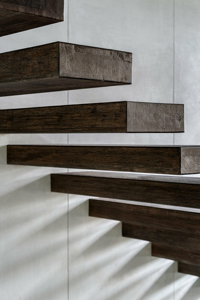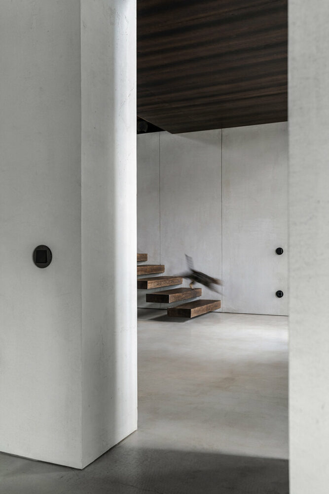 The entrance to the living area reveals a glass vestibule with symmetrical stairs made of the wooden-clad metal console, greeting visitors in the grand hall and leading to the second floor. Handrails were opted from the design to keep with the overall minimalist design and clear geometry of elements — all at the client’s request. To the left of the entrance is a recessed home theater clad in plywood; here, metal cabinets are custom-made based on the bureau’s sketches. Several of these cabinets also find their way into other rooms, acting as unifying elements. The passage from the home theater ultimately leads to the kitchen, where a contrasting metal backdrop emerges, bringing a technological and modern feel to the Relogged interior. The large kitchen island is made of concrete, and the chairs are vintage.