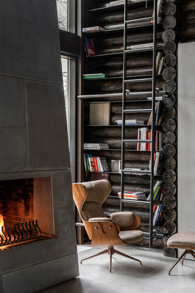 The need for natural daylight finds its way to the spacious living room, where scenic windows overlook the river. Opposite the entrance to the house, a fireplace covered with concrete panels introduces clear geometry to the layout. ‘Near the fireplace area are vertical metal shelves for a substantial library and a cozy reading chair. For convenience, the shelves are equipped with movable metal stairs,’ shares balbek bureau. The walls here are finished with plaster imitating concrete, while microcement unifies the flooring throughout the Relogged house.
