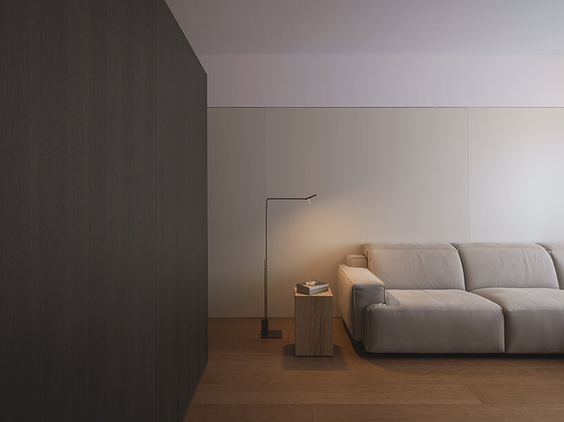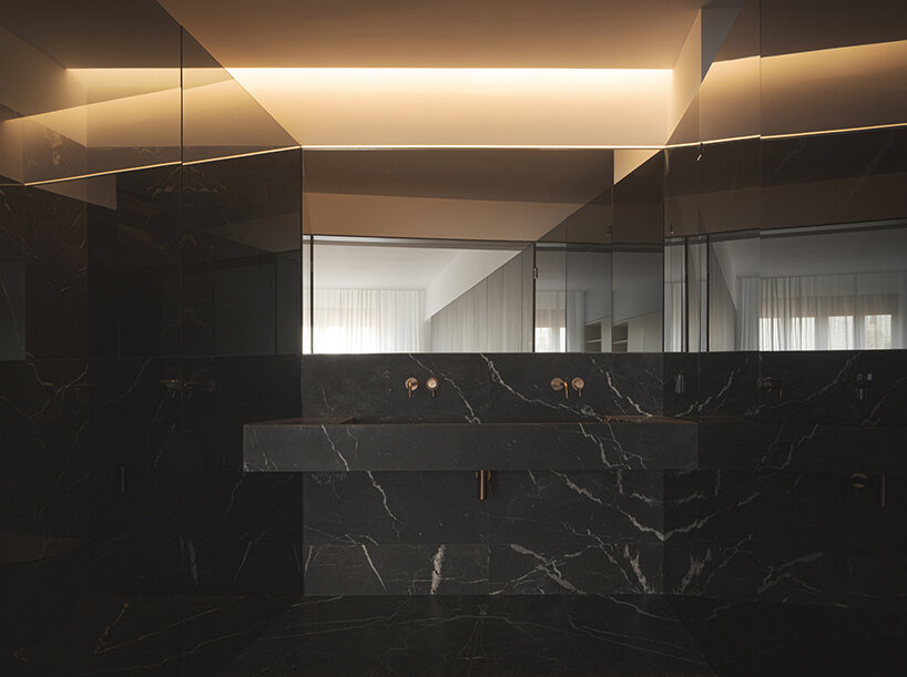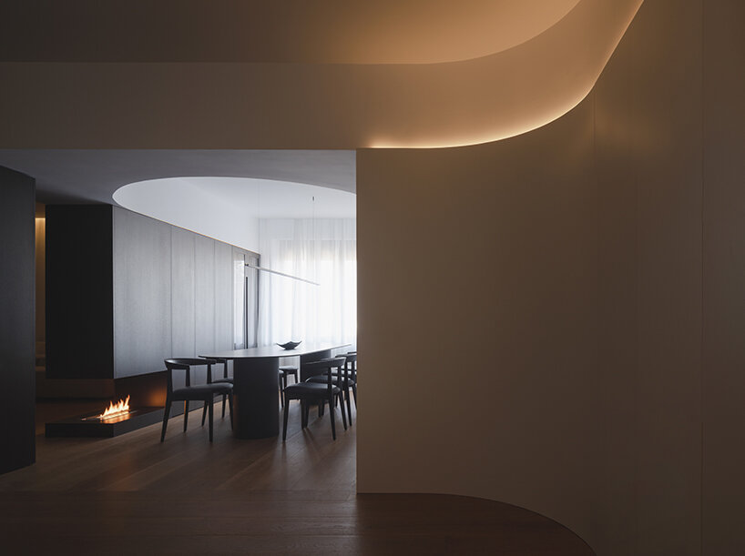 in terms of color and material palette, the architects injected natural and authentic elements into the design, such as marble and wood, to complement the interiors’ overall neutral base. as a result, the rooms mainly feature cream and brown tones that move from dark to light. these colors work in balance with the orange streaks from the chimney fire or the light reflected off the copper cavities in the living room furniture and master bedroom. the idea was to produce a wide chromatic range that works together in harmony, paying attention to every last detail. similarly, the apartment’s lighting can be controlled by an app — flooding the rooms with a warm and soft glow that gives a cozy feel.