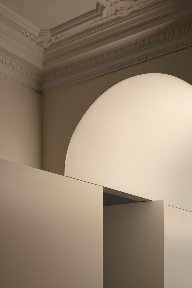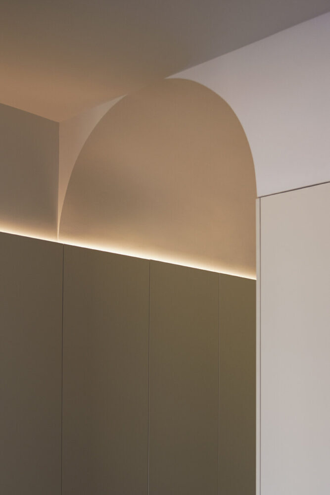 the balzar arquitectos team divided the property into three separate zones. to start, the entrance opens onto a spacious hall with a domed corridor that preserves the ceiling moldings, in tribute to the old décor. the same corridor leads to the study, gym, and shared bathroom — followed by the living area (sitting room, dining, kitchen), a single space solely divided by fixed furniture. meanwhile, the curved ceiling of the dining room echoes the vaulted corridor to further articulate visual continuity and spatial organization. the master bedroom, finally, sits at the far end of the house and includes an en-suite bathroom and dressing room.