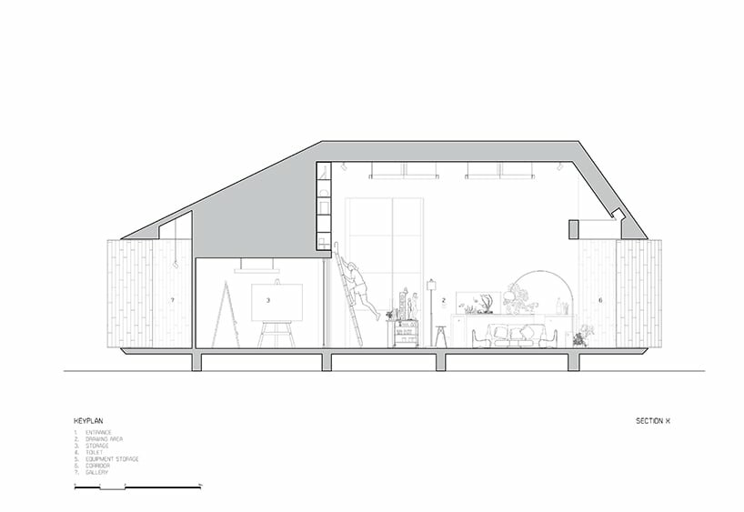 The building formation is designed to house a serene, creative working space for artists working with oil paint. Due to the constant evaporation of the medium, it requires adequate ventilation in order to protect the health of the artists. Resolving this, 11.29 Studio wrapped the facade in bamboo batten walls as a creative design element that roots the structure in its context while enabling ample wind circulation.