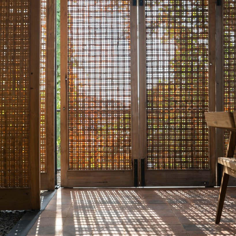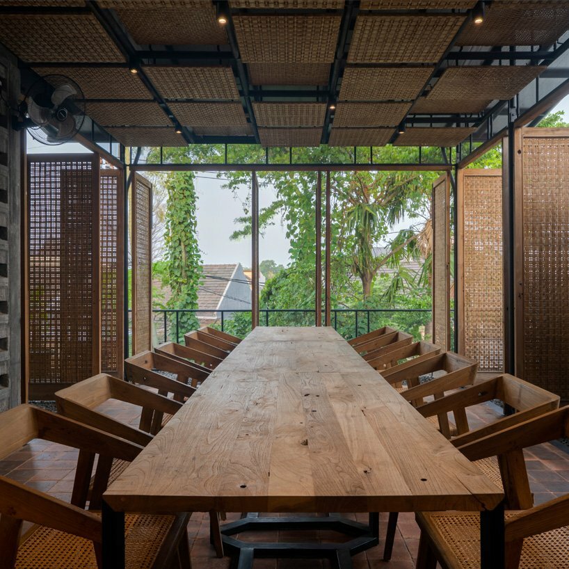 ‘These walls are open, both literally and metaphorically,’ shares lead architect Andy Rahman. Literally speaking, the woven walls can be opened or closed as needed. When opened, the walls seem to have no boundaries and are not isolated from the environment, becoming one with the surrounding nature. Metaphorically speaking, the walls are open to outsiders because the space on the second floor serves as a communal space for meetings, discussions or collaborations with other parties outside the andyrahman team.
