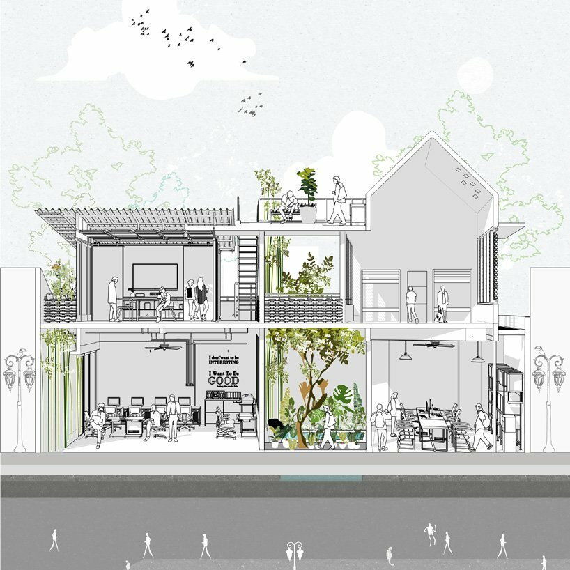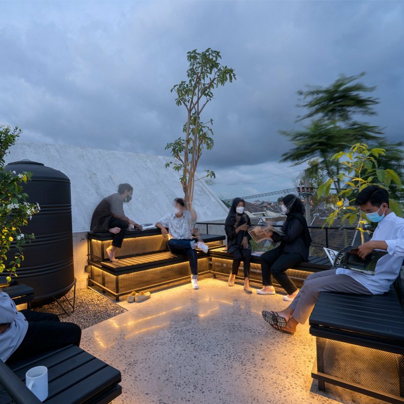 Last but not least, the top floor takes shape as an open square gazebo with a sky roof, used for sitting, hanging out, relaxing, or chatting. It is a healing place where employees can unwind after working all day while enjoying their tea or coffee.
