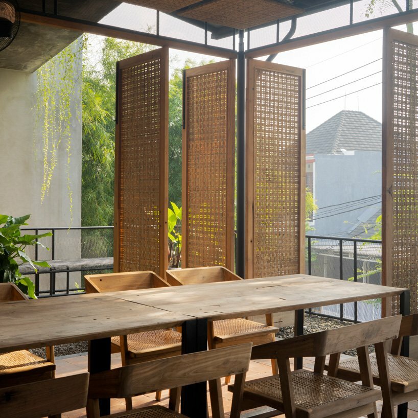 Architecture studio andyrahman has designed a new biophilic workspace in Sidoarjo, East Java, Indonesia. The concept aims to provide people with a healthier and happier place to work in, minimizing stress levels and thus reigniting the employee’s love for everyday life. More importantly, the new studio is formed as a place where the architects can draw inspiration and come up with new innovative ideas. Open spaces, verdant gardens, and ‘breathing walls’ made of bamboo complete the office, forming a pleasant contemporary environment that integrates design with nature. bamboo 'breathing walls' draw natural light in andyrahman's biophilic workspace in indonesia
