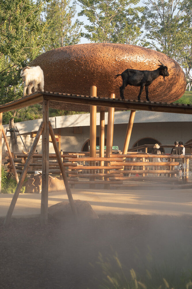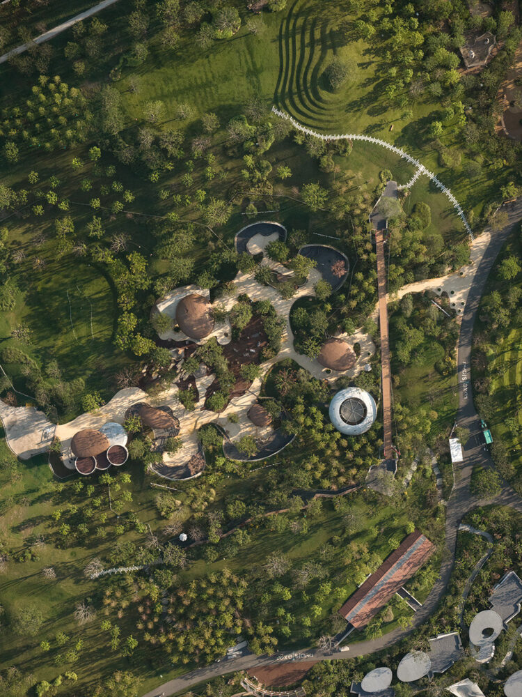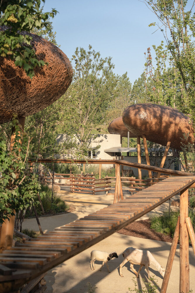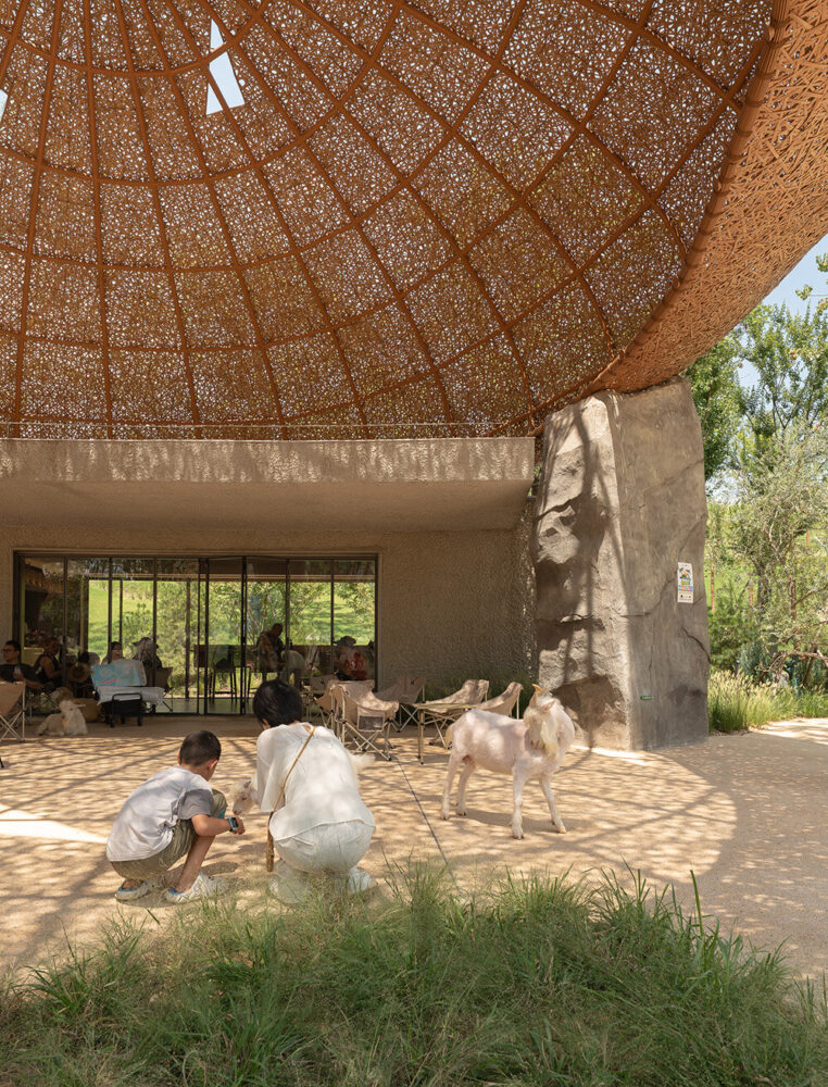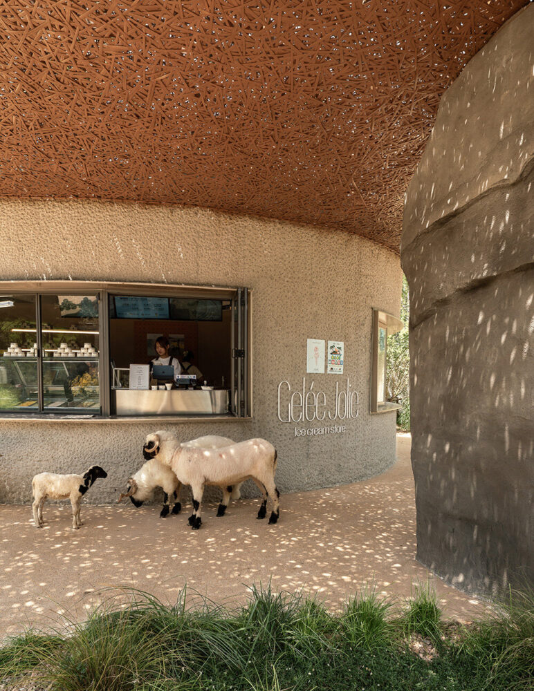 The creative workshop is a lightweight bamboo-woven pavilion composed of a domed canopy and stone-like supports. Triangular perforations in the bamboo surface allow filtered daylight to create dynamic shadow patterns. The open layout functions as a café, rest area, and flexible workspace, with operable facades connecting directly to surrounding greenery. A secondary pavilion, a ‘silver disc,’ houses an ice cream and donut station. Its metallic surface contrasts with the earthy tones of adjacent structures, serving as a visual focal point within the site. A nearby feed house encourages closer interaction between visitors and animals, reinforcing the site’s social and experiential role.