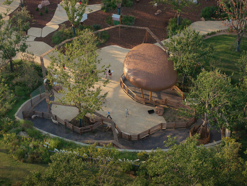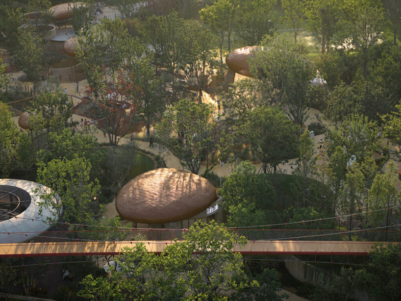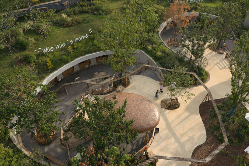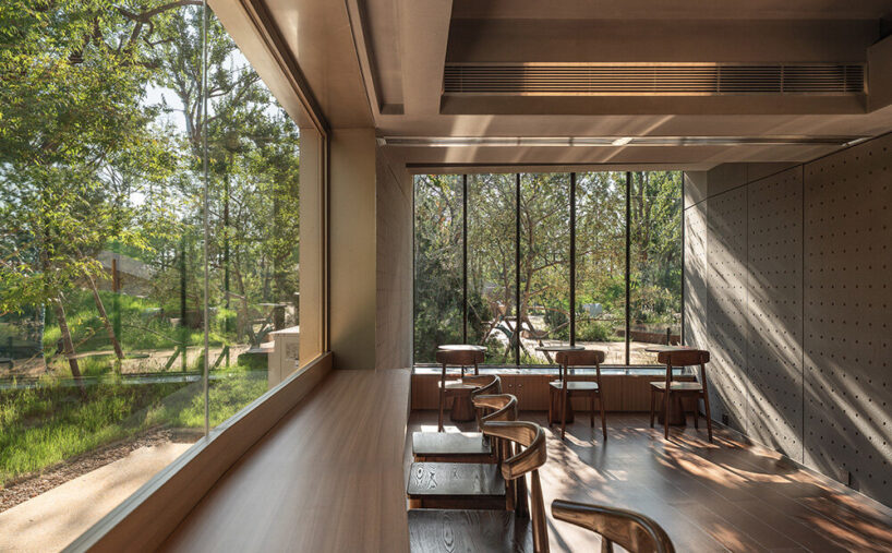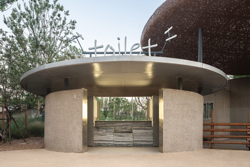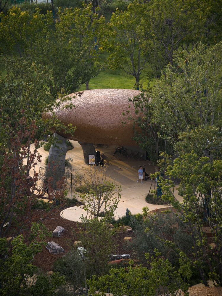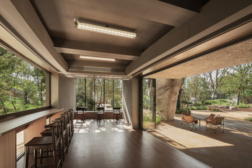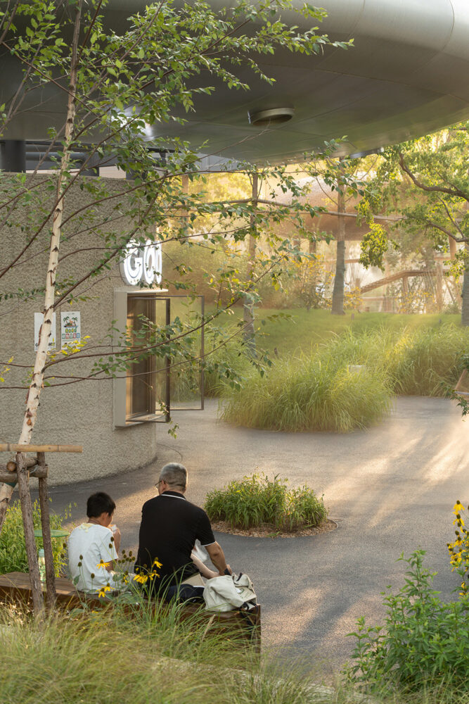 The creative workshop is a lightweight bamboo-woven pavilion composed of a domed canopy and stone-like supports. Triangular perforations in the bamboo surface allow filtered daylight to create dynamic shadow patterns. The open layout functions as a café, rest area, and flexible workspace, with operable facades connecting directly to surrounding greenery. A secondary pavilion, a ‘silver disc,’ houses an ice cream and donut station. Its metallic surface contrasts with the earthy tones of adjacent structures, serving as a visual focal point within the site. A nearby feed house encourages closer interaction between visitors and animals, reinforcing the site’s social and experiential role.