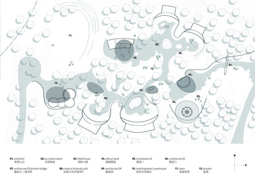 the masterplan adopts a circular layout linking animal enclosures, workshops, and dining spaces