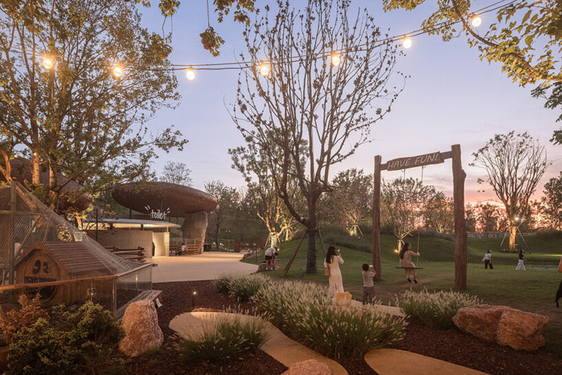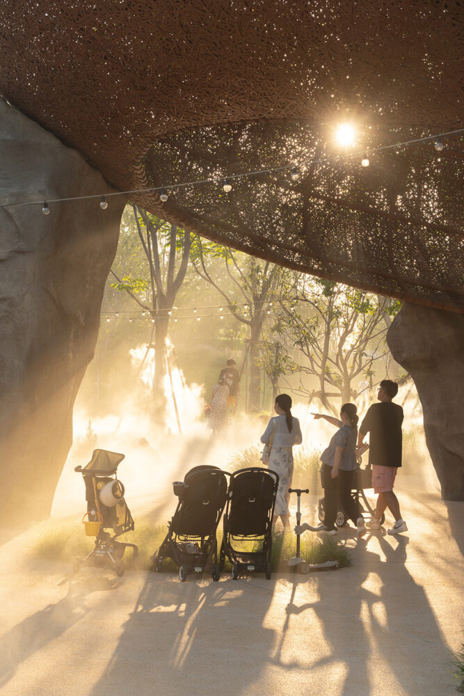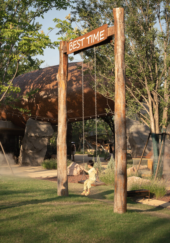 The feed barn and washroom are designed as a paired composition, characterized by bamboo-and-metal roofs that appear to float above textured stone and cement finishes. The design team at Various Associates uses artisanal coatings and muted color palettes to emphasize material honesty and spatial coherence across programmatic functions. At the Forest Star Stage, a flexible outdoor area supports events and performances. Defined by sawdust flooring, hay bale seating, and ambient lighting, it transforms from a daytime resting area into an evening gathering space.