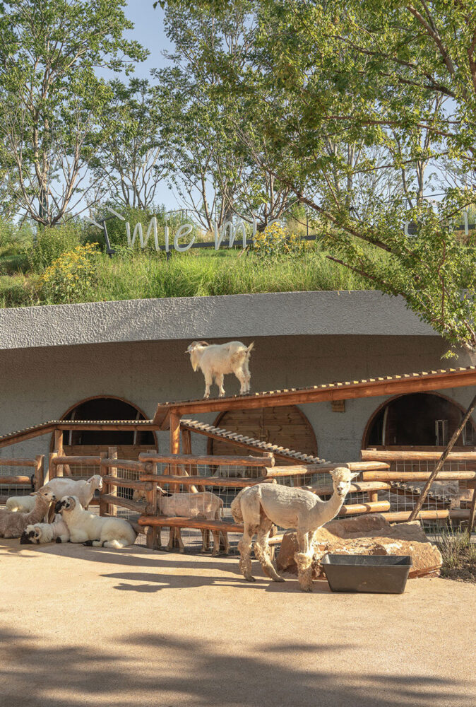 Set against the hillside, the animal enclosures are designed with minimal intervention to preserve the existing terrain. Their partially earth-sheltered configuration blends the farm into its surroundings, while open paddocks and shaded frameworks create varied environments for alpacas, deer, and other animals. The design emphasizes both safety and proximity, encouraging educational and recreational interaction between visitors and animals.