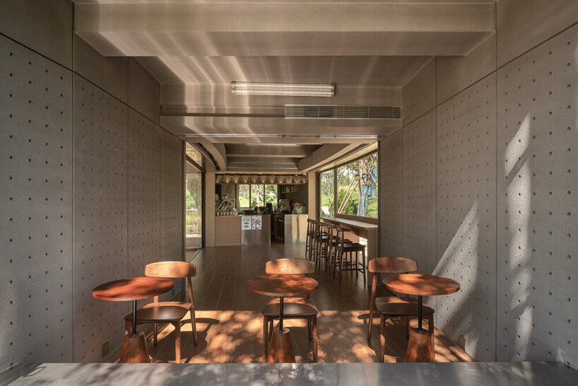 the feed barn and washroom pair share bamboo-and-metal roofs that appear to float above stone surfaces