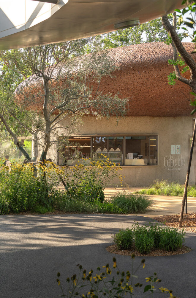 a silver disc pavilion houses an ice cream and donut station, contrasting with the site’s earthy tones