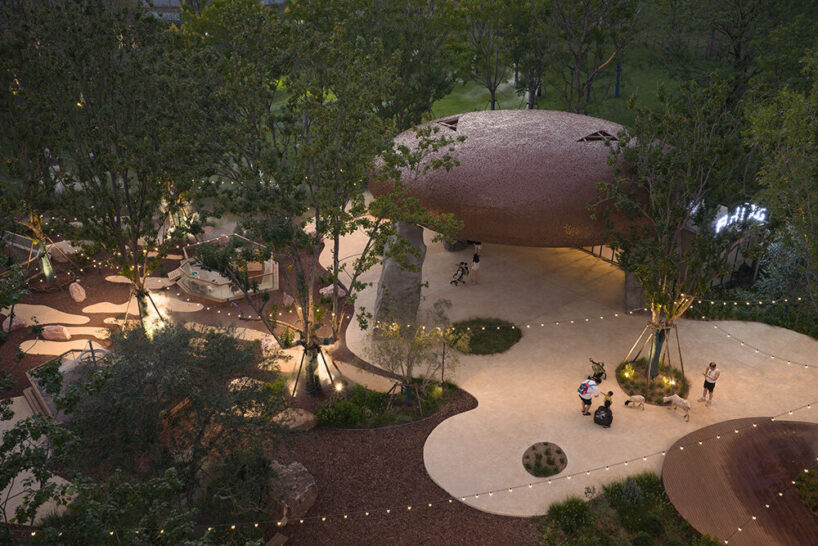 the creative workshop features a lightweight bamboo-woven dome supported by stone-like columns