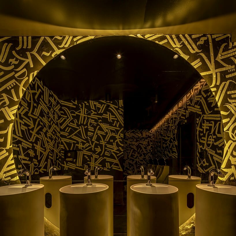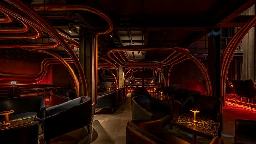 Stepping inside, a stark contrast in tone defines the space, creating a dark, sophisticated ambience spotlit with subtle lighting accents, sculptural design elements, and luxury material finishes. In particular, the project is characterised by a twisted visual motif that extends throughout the space in the form of iconic copper tube frames.