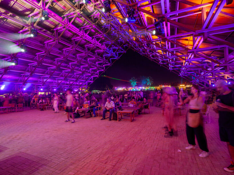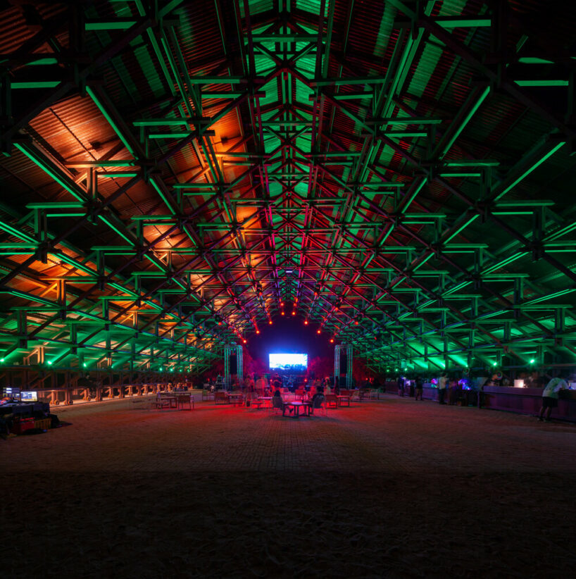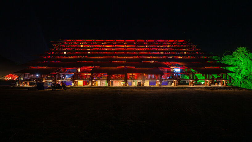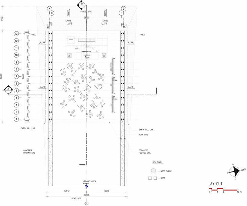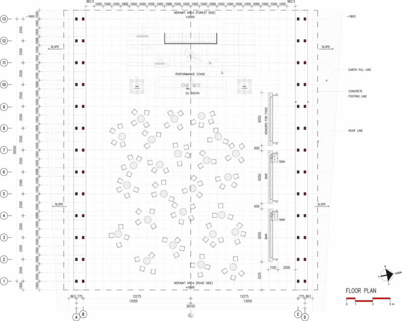 the project sits like a ring placed over the terrain, with its funnel-like roof forming a shaded perimeter walkway and an introverted core.