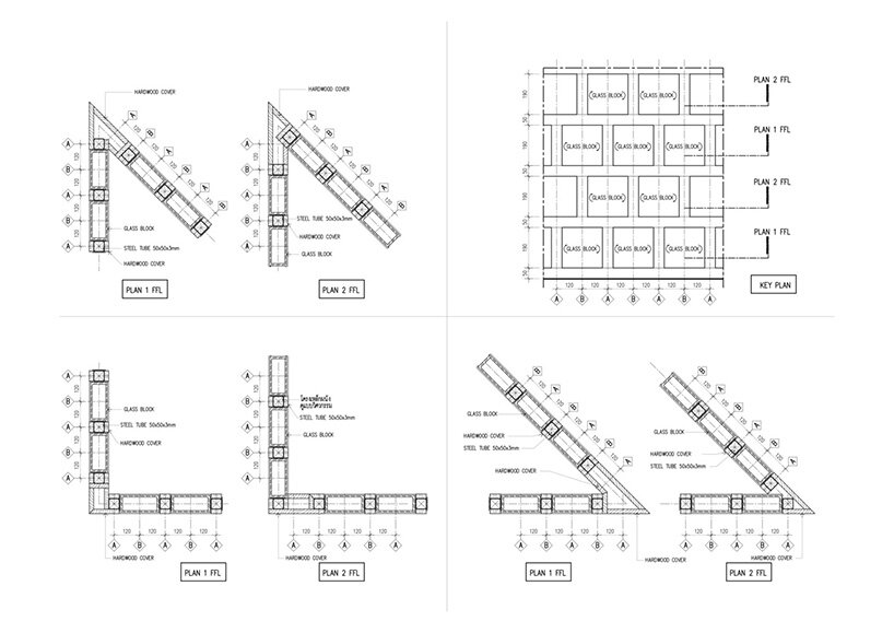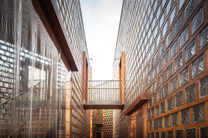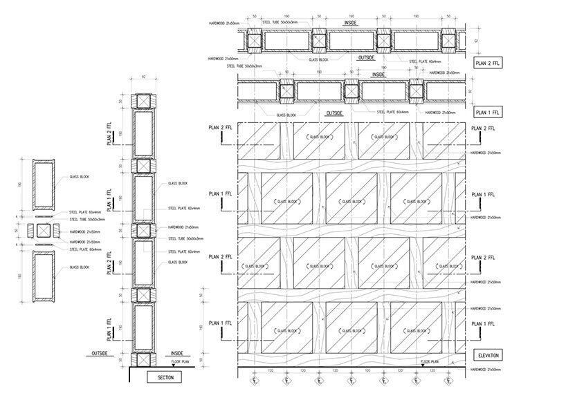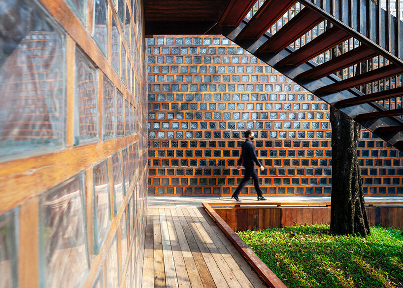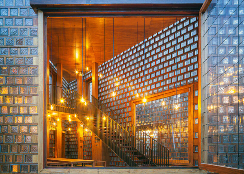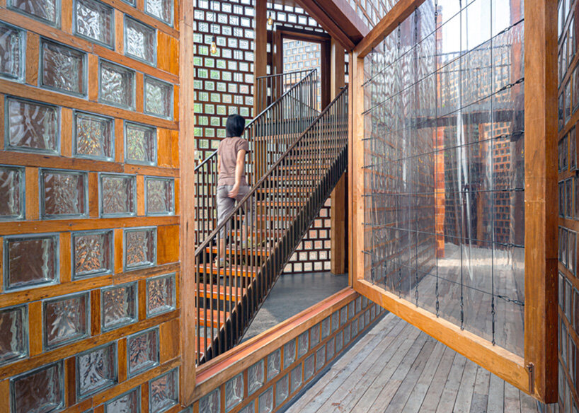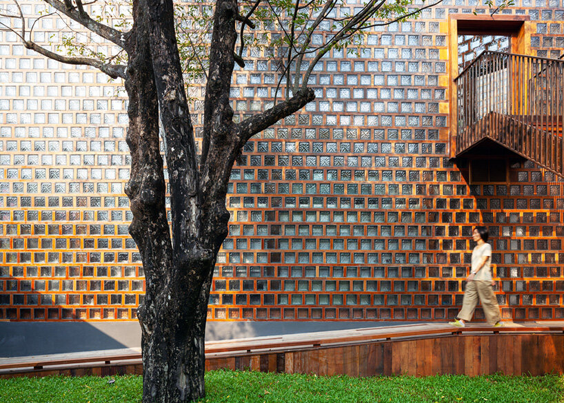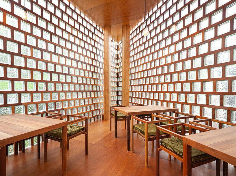 premthada specified the restaurant’s characteristic glass blocks as he wanted to give new value to overlooked materials. ‘I added value to these disfavored items by planking them with wooden frames so that the color of the wood is reflected into the blocks,’  says the architect.