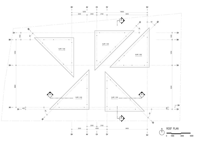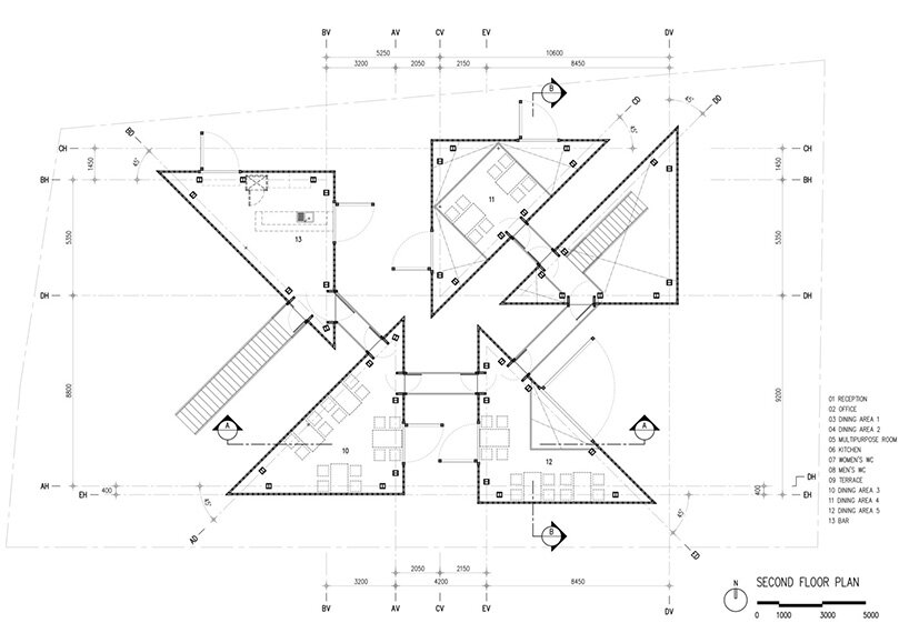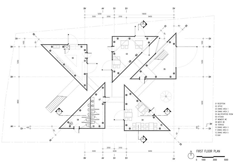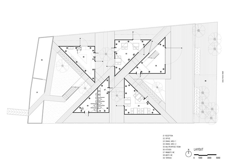 the restaurant is composed of five triangular volumes, which are arranged to leave paths and courtyards in between them as well as a riverfront terrace. each volume has a different function but they’re all unified with the same construction: timber frames and translucent glass blocks.