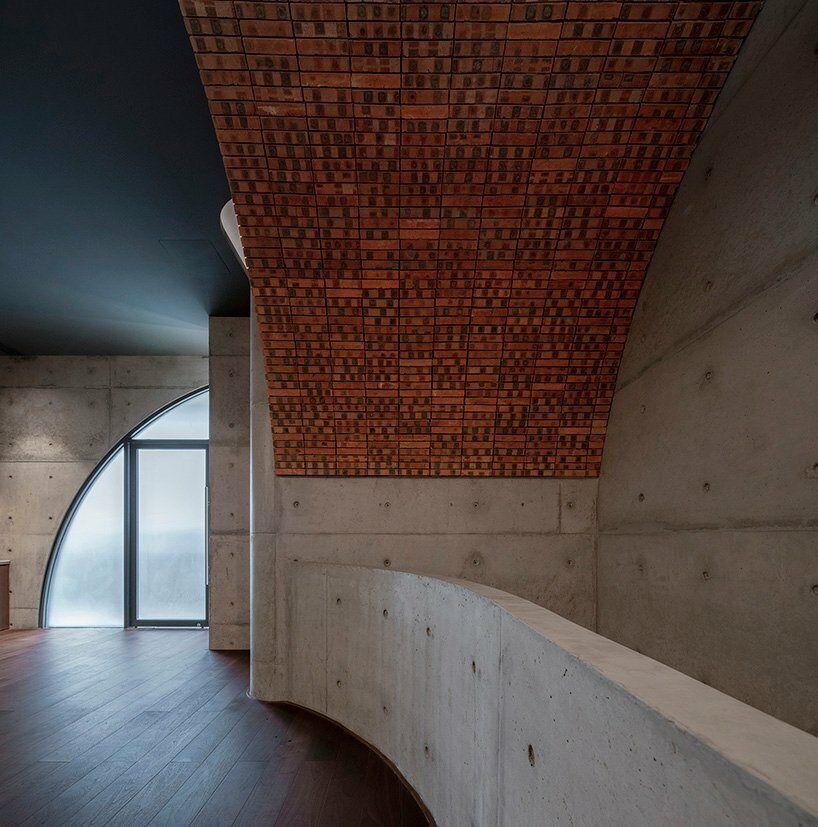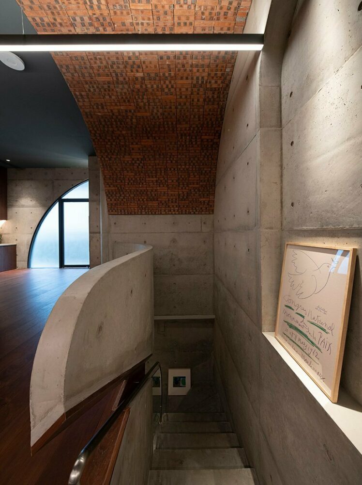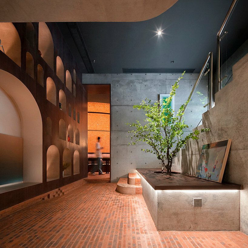 raw brick and concrete materiality illuminated by soft lighting exudes a warm ambience