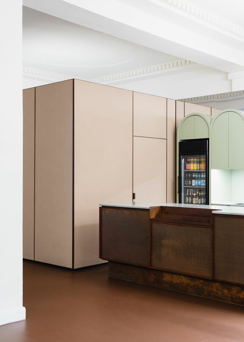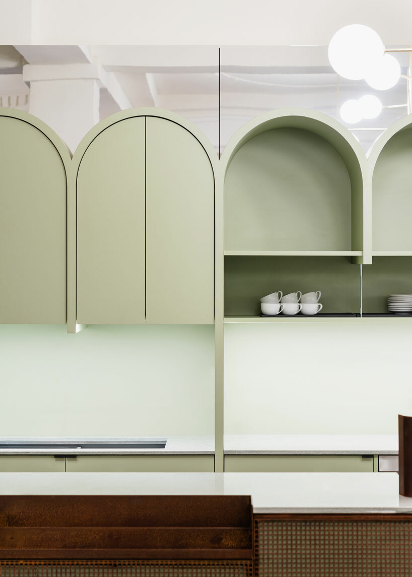 for the concession stand in the foyer, batek architekten picked up the arched motif from the cinema façade and added a contemporary pistachio green shade. the architects also incorporated corten steel, which was upcycled from the previous bar, and pale natural cork to complement the earthy reddish-brown of the original linoleum flooring.