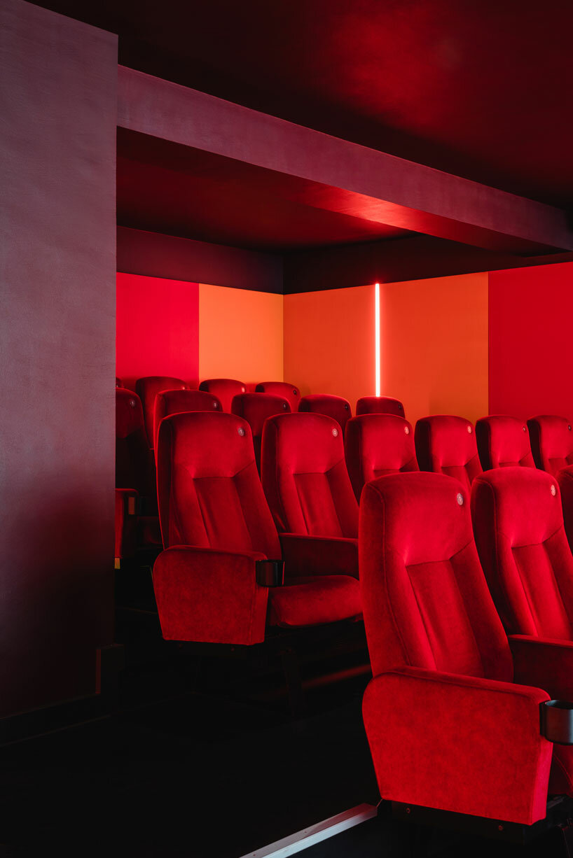 the red auditorium recalls classic cinema interior aesthetics