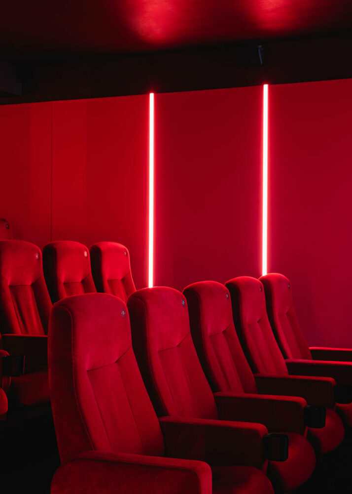 for the two auditoriums, batek architekten created two striking color palettes that recall the golden age of cinema. inside one screening room, sumptuous folds of dark prussian blue fabric contrast with golden yellow-upholstered seating. the other screening room interprets the classic cinema interior with a range of reds from rust to crimson covering the walls and seating and long vertical strips of light at regular intervals along the side walls. the auditorium works also included installing new podiums to allow for optimal visibility.