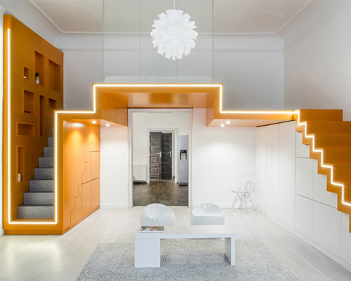 in budapest, hungary, gergő batizi-pócsi and péter batizi-pócsi of batlab have constructed a project called ‘youth to youth’, an elegant apartment for a young couple. ‘we were trying to validate design and functionality equally, which resulted in our trying to achieve such consistency and homogeneity that can as well incorporate male and female differences,’ says the duo. this goal was accompanied by the client’s idea for a bedroom loft with two staircases. in turn, the concept was translated into the main accent, a homogenous ribbon of medium density fiberboards that negotiates the rest of the spatial manipulations and programmatic distribution.
