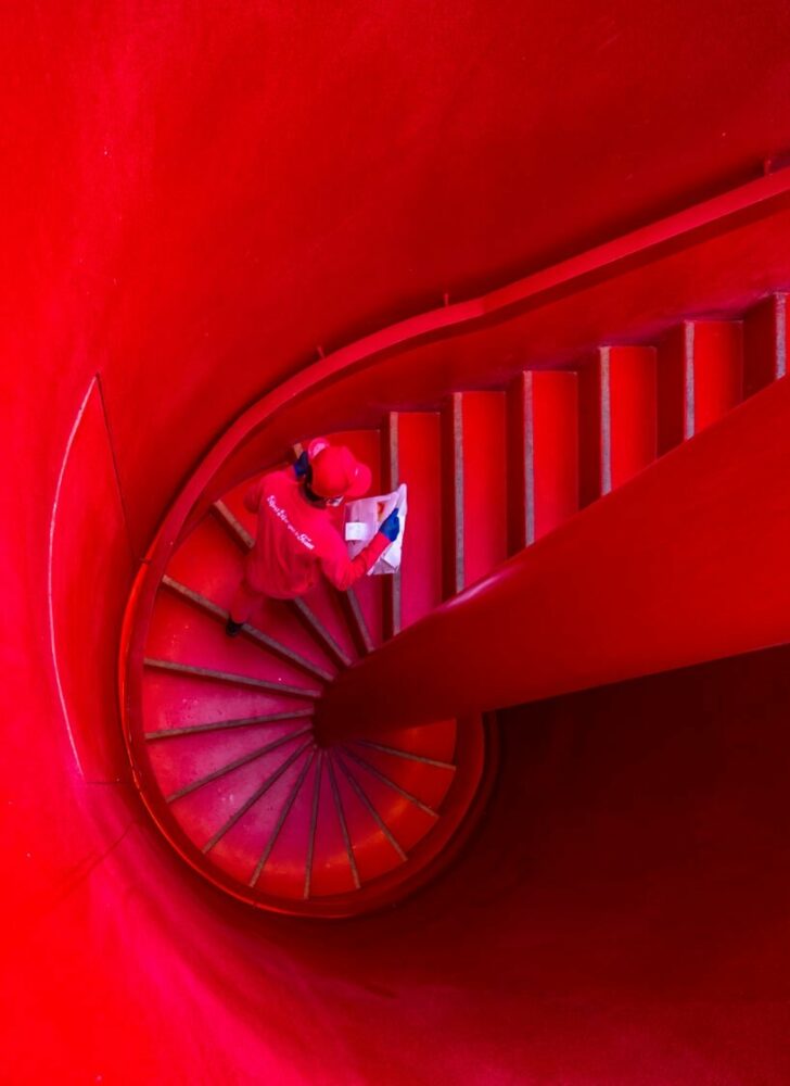 red spiral staircase links BBT Hilltop’s interior and exterior zones
